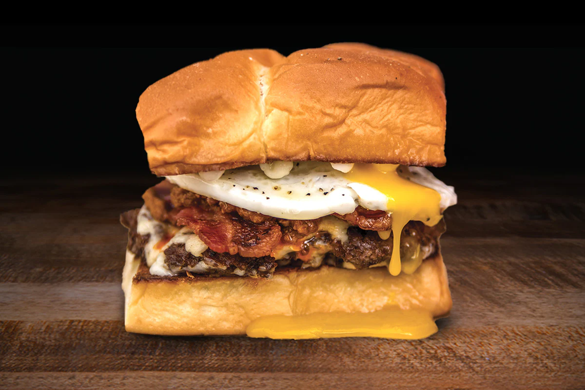 white american cheese, smoked bacon, haus chili, fried egg & mayo atop a smash burger made with hormone- and antibiotic-free creekstone farms' premium angus beef; on grilled king's hawaiian rolls