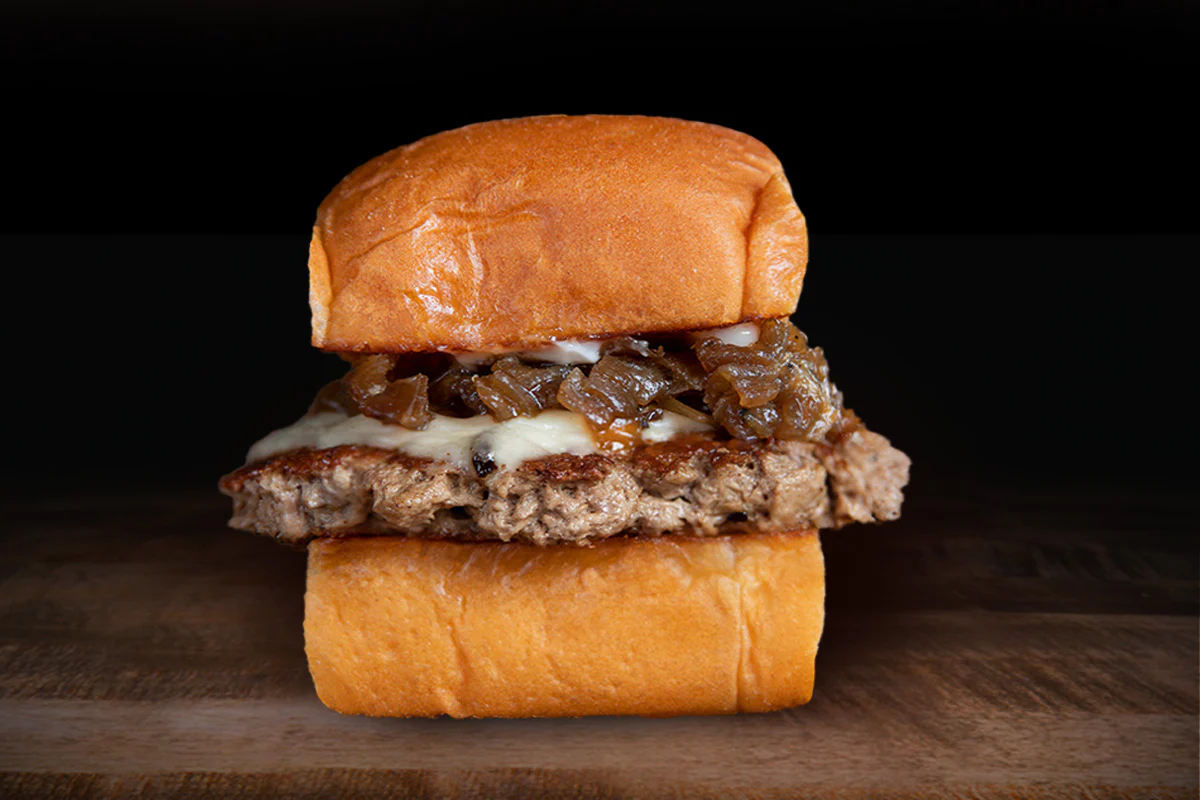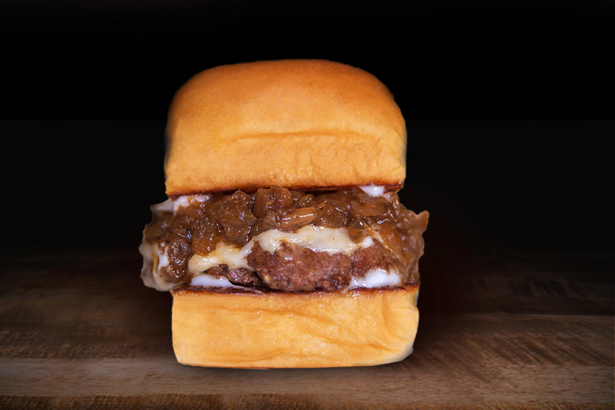 mayo, white american cheese & caramelized onions atop a mini smash burger made with impossible® plant-based patty: on a grilled king's hawaiian roll