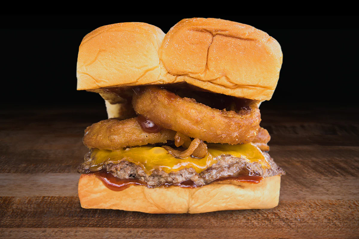 cheddar cheese, smoked bacon, onion rings & bbq sauce atop a smash burger made with hormone- and antibiotic-free creekstone farms' premium angus beef; on grilled king's hawaiian rolls