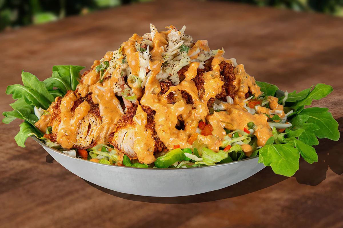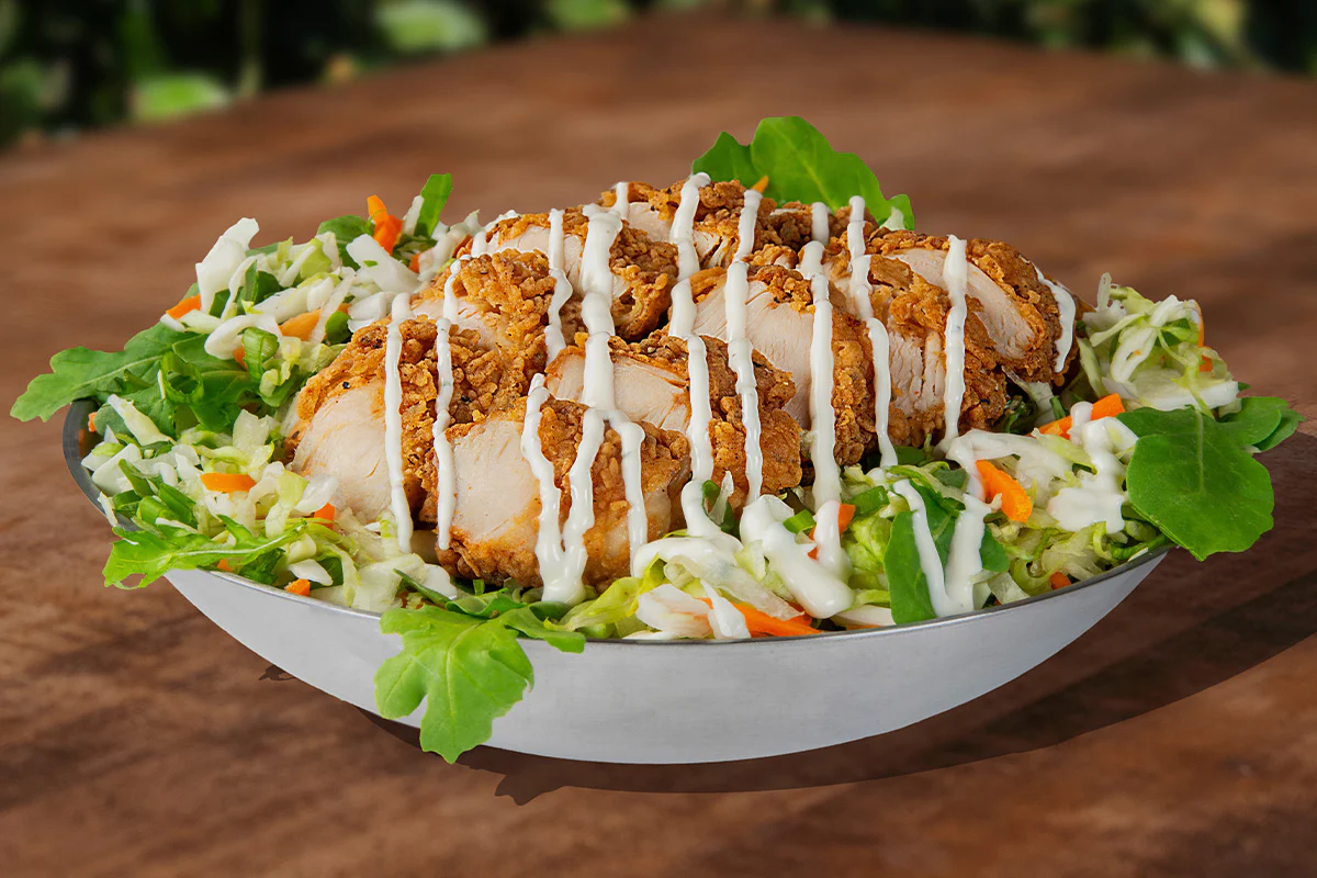 Dog Haus’ Bad Mutha Clucka served as a bowl features two beer battered or grilled hormone- and antibiotic-free chicken tenders, pickles & miso ranch atop a bed of mixed greens