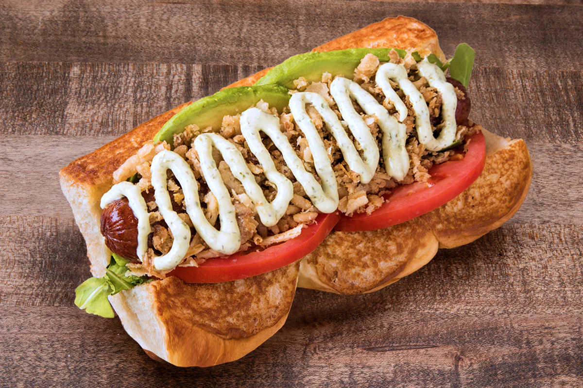 wild arugula, avocado, tomato, crispy onions & spicy basil aioli atop a plant-based sausage; on grilled king's hawaiian rolls