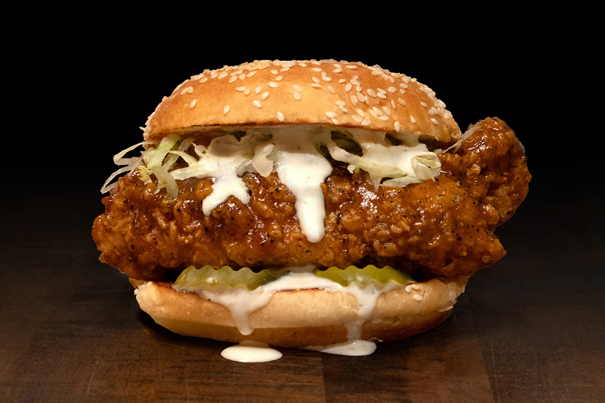 crispy white meat chicken tender smothered in Jake Paul’s signature El Gallo SAAUUCCEE—a knockout blend of sweet honey, tangy mustard, smoky bbq sauce, black pepper and secret spices—lettuce, pickles and miso ranch dressing; on a Big Marty’s Sesame Roll.