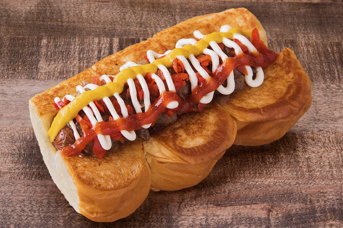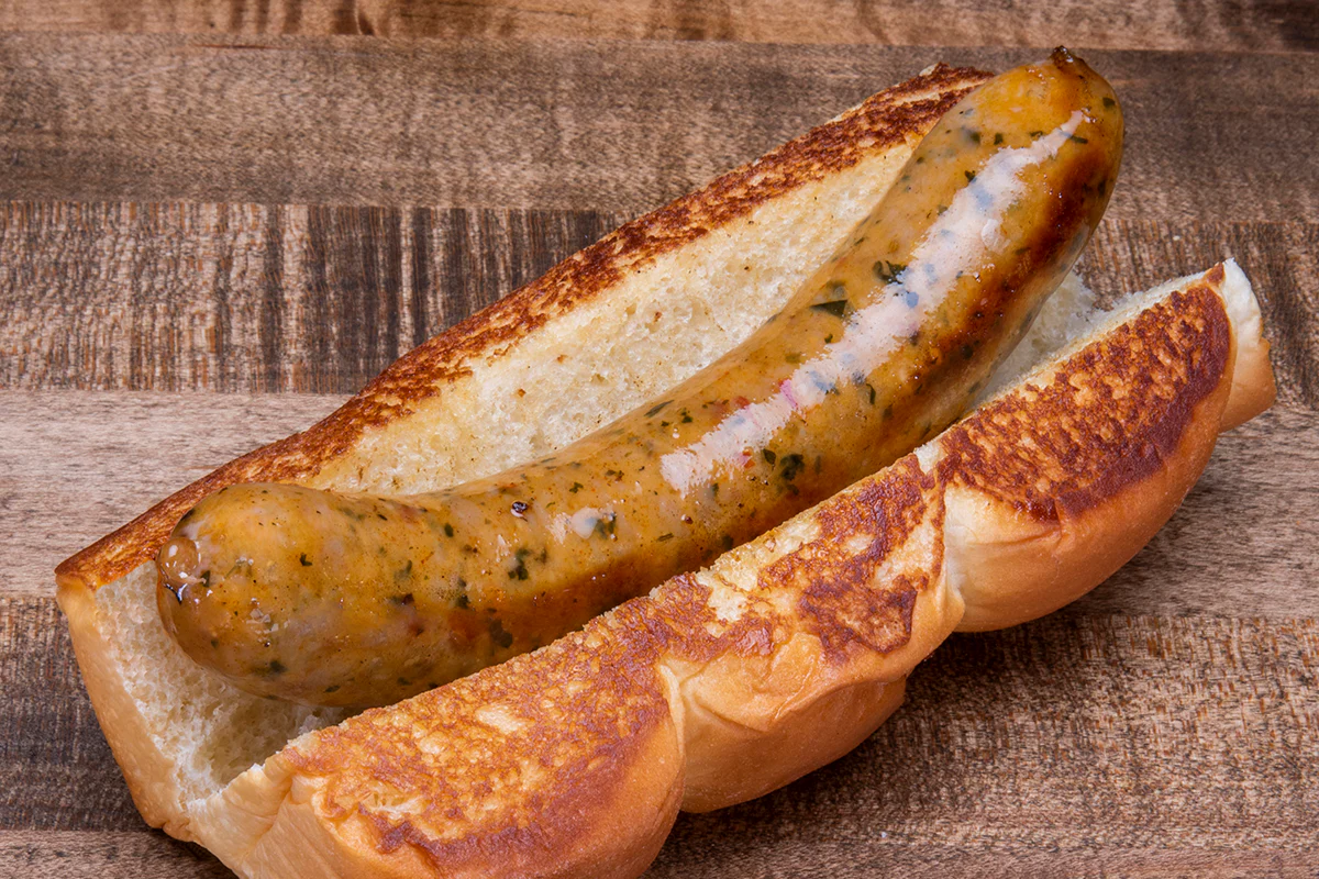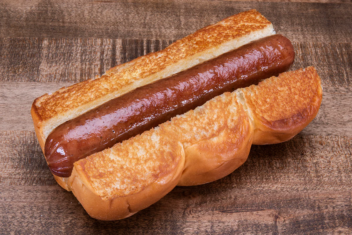 our proprietary hormone- and antibiotic-free sausages: on grilled king’s hawaiian rolls