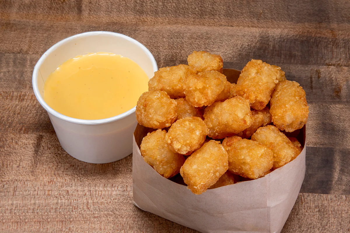 golden and crispy, topped with cheese sauce