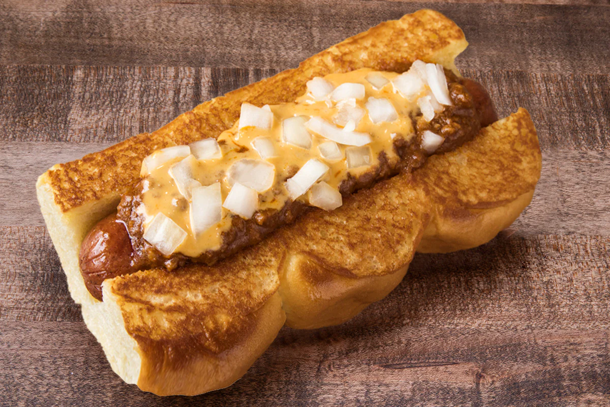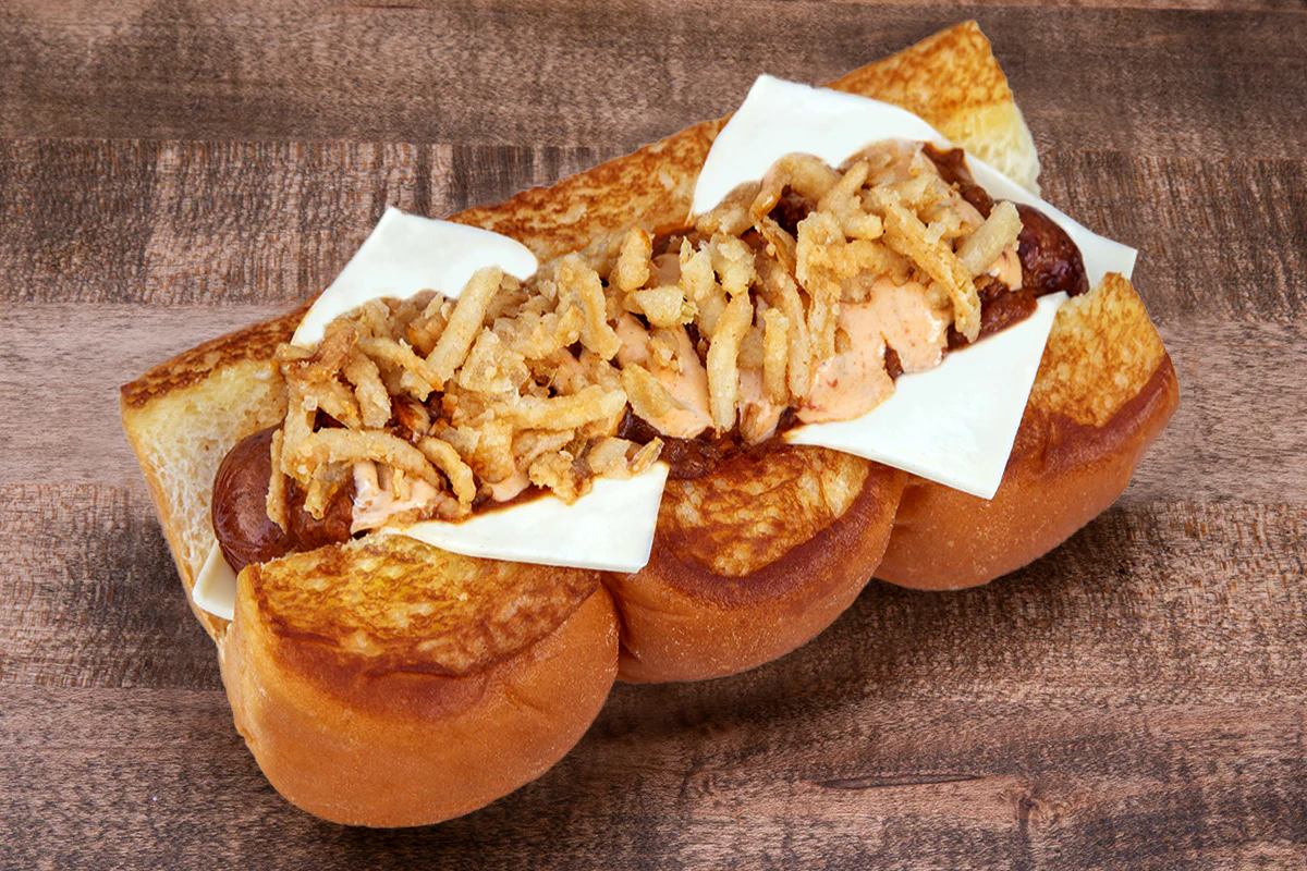 haus chili, cheese sauce & onions atop our proprietary creekstone farms hormone- and antibiotic-free premium angus all beef dog; on grilled king’s hawaiian rolls