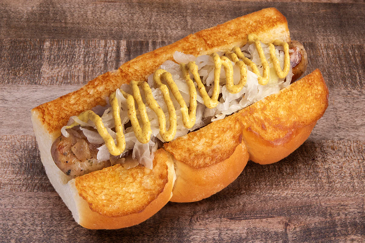 sauerkraut, caramelized onions & spicy brown mustard atop a plant-based bratwurst; on grilled king's hawaiian rolls
