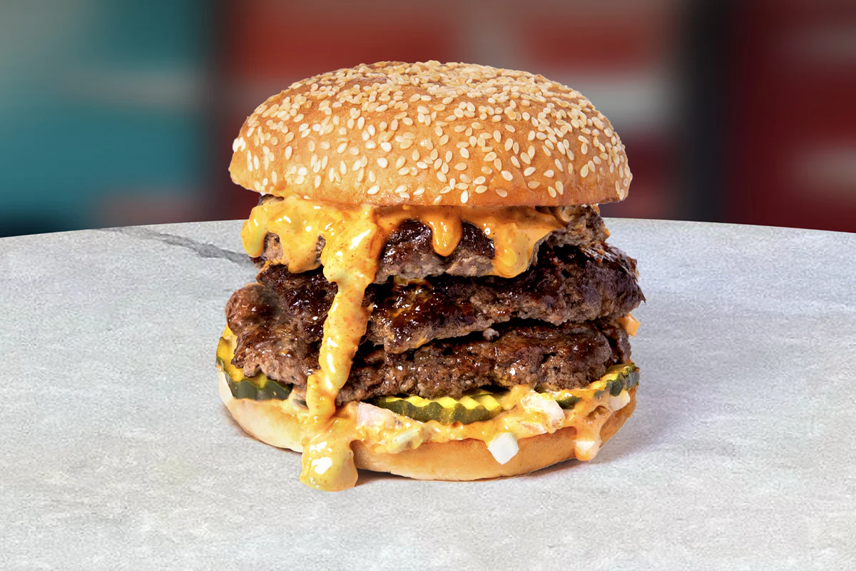 Three smashed Creekstone Farms beef patties, pickles, diced onions & belly sauce; on a Big Marty's sesame seed bun