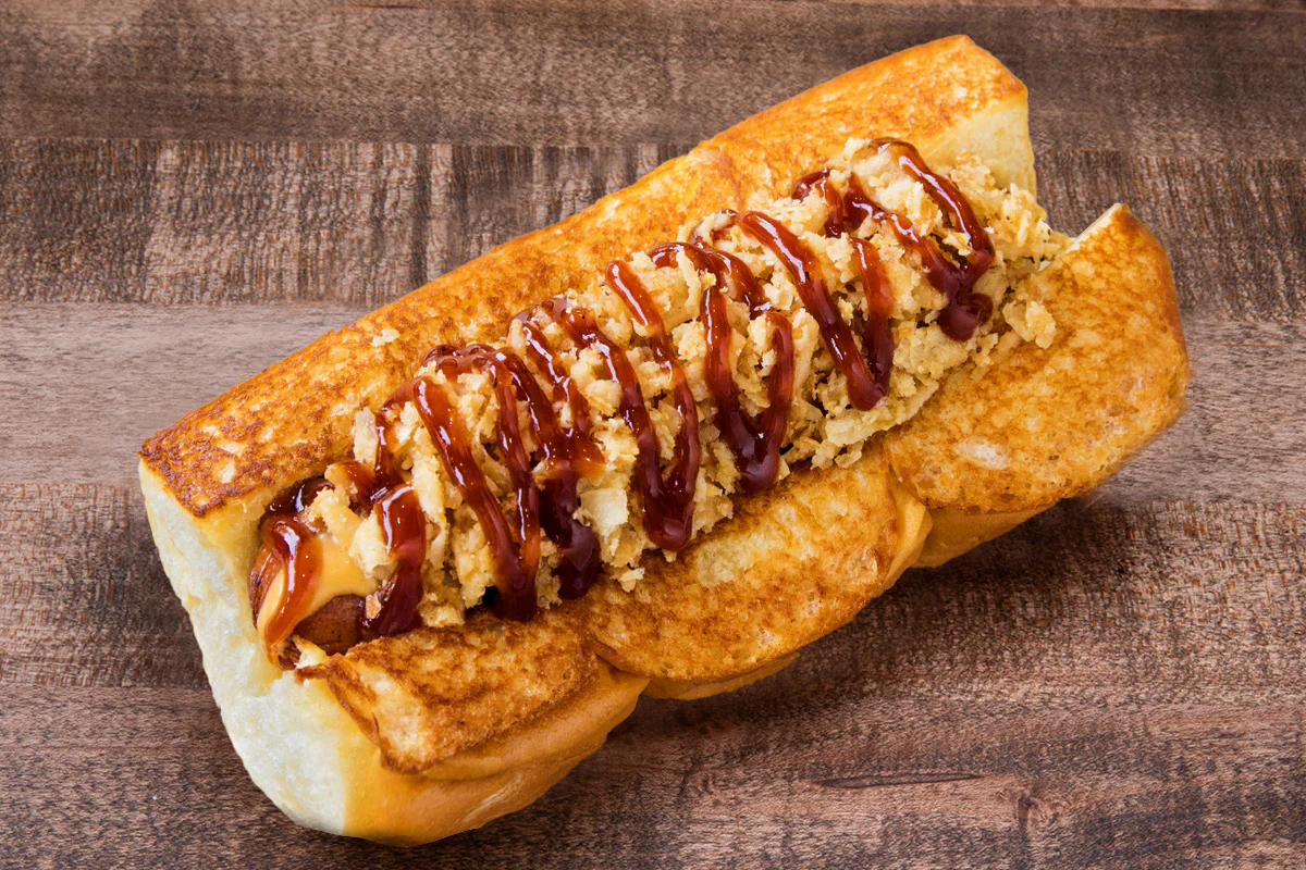 smoked bacon, cheese sauce, crispy onions, bbq sauce atop our proprietary creekstone farms hormone- and antibiotic-free premium angus beef dog; on grilled king’s hawaiian rolls
