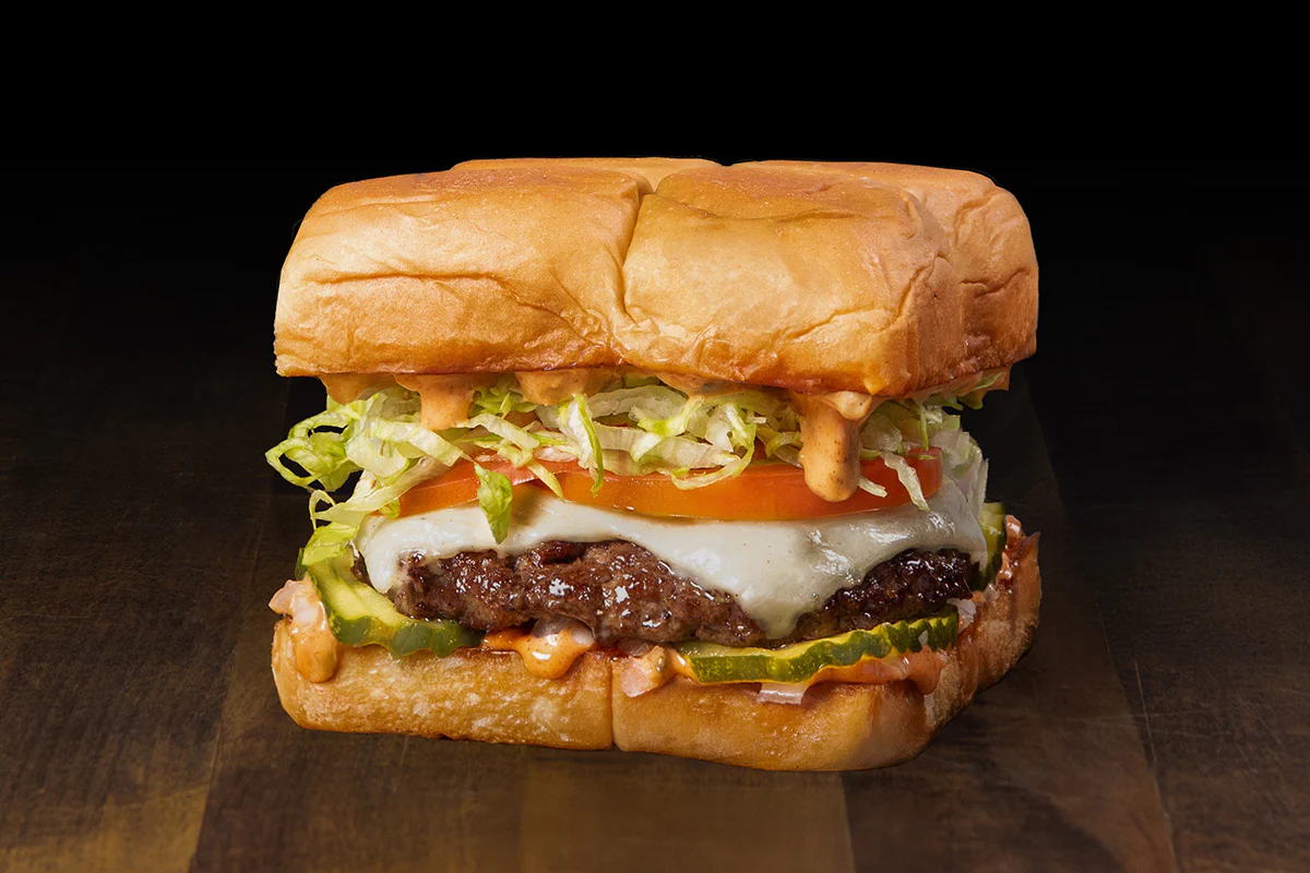 white american cheese, pickles, lettuce, tomato, onion & secret sauce atop a smash burger made with hormone- and antibiotic-free creekstone farms' premium angus beef; on grilled king's hawaiian rolls
