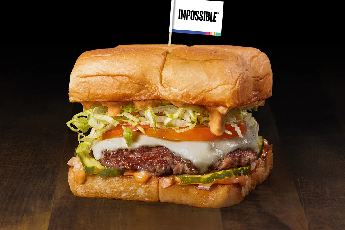 pickles, lettuce, tomato, onion, white american cheese & secret sauce atop a smashed impossible® plant-based patty; on grilled king's hawaiian rolls