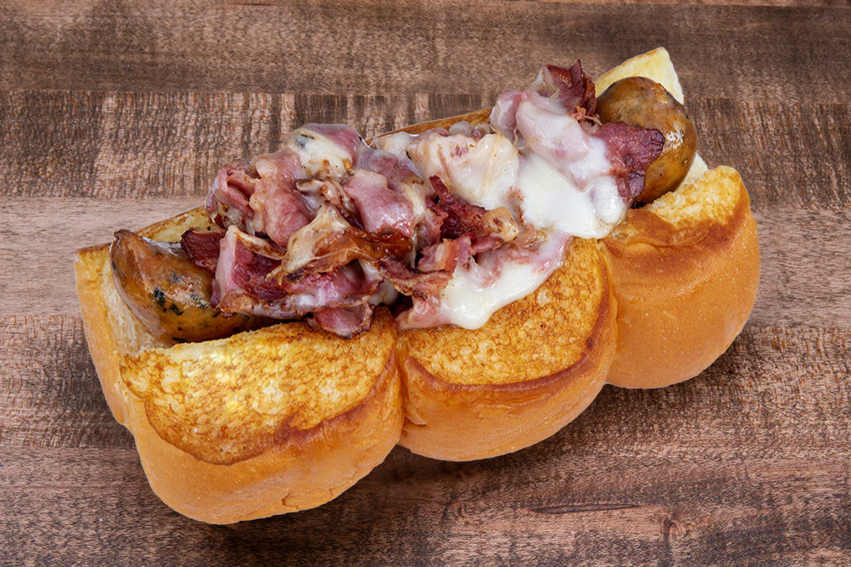 pastrami & mozzarella cheese atop our proprietary hormone- and antibiotic-free spicy italian sausage; on grilled king's hawaiian rolls